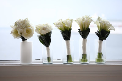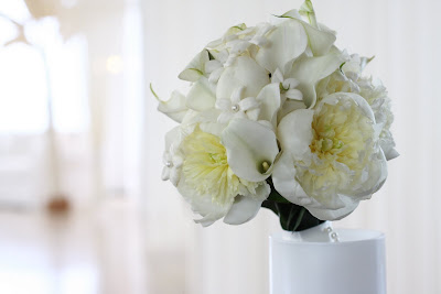 Bride carried white peonies (thankful I got them in July, they were small but still very beautiful), white callas and white stephanotis with pearl pin accent. Bridesmaids carried all white callas, junior bridesmaid a mix of white peonies and callas.